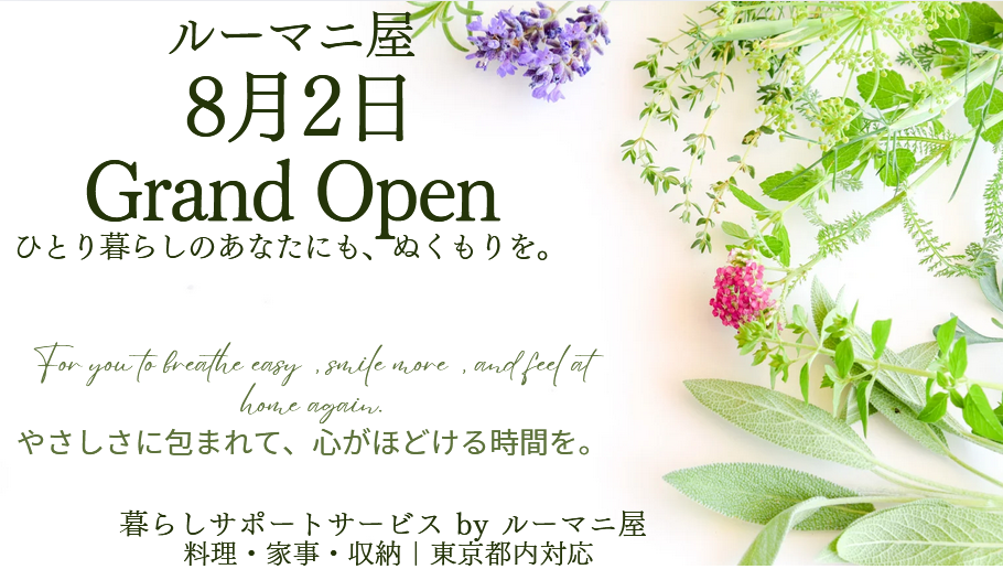 8月限定】ひとり暮らしのあなたに贈る“やさしい贅沢”|ルーマニ屋 暮らしサポート特別プラン【2025年8月限定】東京都内・高級オーダーメイド家事&料理サポート|ルーマニ屋グランドオープン記念プラン 2025年8月、東京都内に新たに誕生した“ルーマニ屋”では、一人ひとりの暮らしに寄り添う 完全オーダーメイドの家事・料理サポートサービスをスタ...